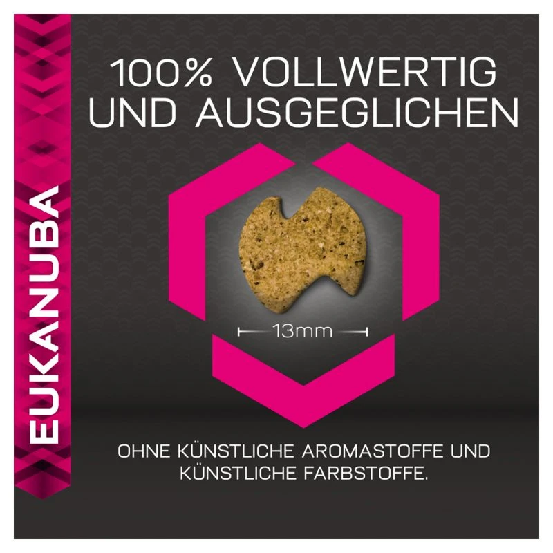 Vous avez déjà partagé de nombreuses aventures avec votre chien, et ce n’est pas fini. Pour que votre compagnon reste en pleine forme au fil des années, offrez-lui des aliments premium répondant à tous ses besoins. Les aliments secs en croquettes Eukanuba, riches en agneau et en riz, conviennent parfaitement aux chiens adultes de petite race et race moyenne. Ils sont aussi particulièrement adaptés aux chiens à l’estomac sensible. En effet, le riz et l’agneau de haute qualité sont très faciles à digérer. Le mélange de fibres sur mesure, comprenant des prébiotiques et de la pulpe de betterave, favorise lui aussi la digestion. Le poulet offre, comme l’agneau, une source de protéines participant au développement d’une masse musculaire puissante et maigre. Les aliments secs Eukanuba contiennent aussi de la L-carnitine qui aide à réduire la masse grasse. Votre chien conserve un poids optimal et une grande souplesse articulaire. Les croquettes hexagonales et le système de protection dentaire DentaDefense, exclusivités Eukanuba, contribuent au maintien de dents propres et saines à long terme. De plus, les croquettes Eukanuba contiennent des sources naturelles d’oméga-6 et oméga-3 qui favorisent la santé et la brillance du pelage et réduisent la perte de poils. Enrichis au curcuma, source naturelle d’antioxygènes, les aliments secs Eukanuba renforcent également le système immunitaire. L’alimentation est 100 % complète et équilibrée. Très riches en agneau et en riz, les aliments Eukanuba conviennent idéalement aux chiens adultes de petite race et race moyenne tels que les beagles, colleys, cockers spaniels et teckels.