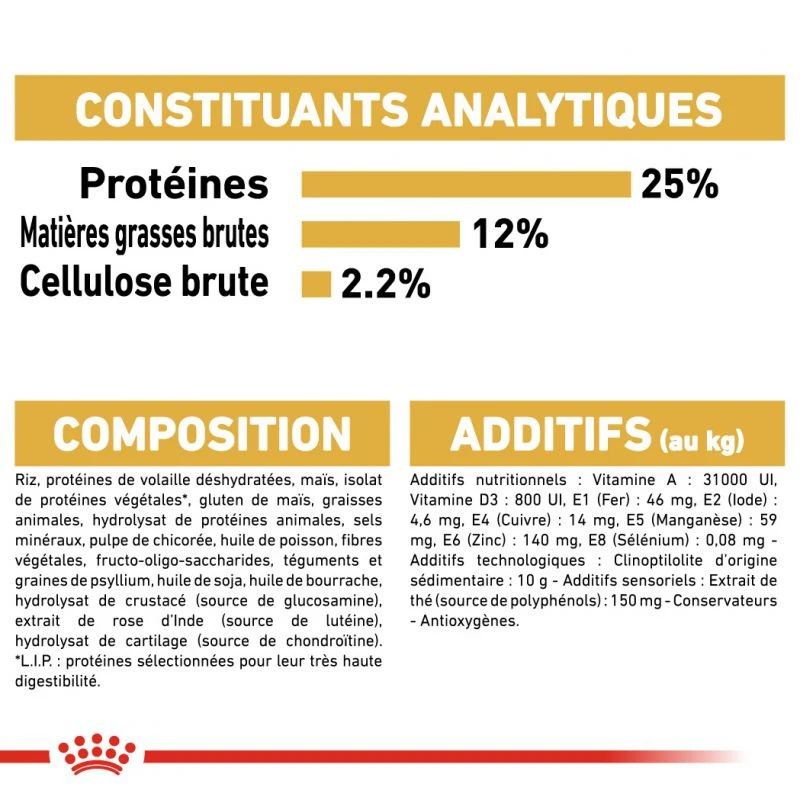 Dans les aliments ROYAL CANIN Miniature Schnauzer Adult, la teneur en matières grasses est modérée, ce qui, associé à une dose quotidienne d’exercice, favorise le maintien d’un poids corporel sain. Les croquettes ROYAL CANIN Miniature Schnauzer Adult ont été spécialement développées pour les chiens Miniature Schnauzer. Grâce à l’utilisation de composés liant le calcium (chélateurs), la formule alimentaire favorise l’hygiène buccale en inhibant la formation de tartre.